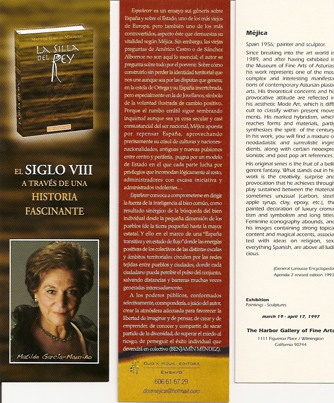 Las tres categorías de temas propios del arte parietal, zoomorfos, antropomorfos y signos, repite Méjica en buena parte de su Prehistórica. Como aquéllos, pueden aparecer sus "iconos prehistóricos" aislados o formando grupos, también con evidente descuido, en ocasiones, de las proporciones respectivas. Si a menudo se ha negado el sentido de composición al artista paleolítico y se han estudiado los conjuntos como sumas de motivos aislados, sin organización alguna, esta ausencia de composición aparente ha sido tomada por Méjica no sólo como característica personal, sino como un argumento más a favor del sentido mágico de su obra. La policromía, el recurso a los "estigmas" del soporte, las superposiciones, tan frecuentes en el arte primigenio, así como la clara ausencia de cualquier intento por sugerir paisaje o atisbo realista, son otras características asumidas plenamente por el arte de este asturiano universal. Indefectiblemente, la obra de Méjica ha sido objeto de numerosas interpretaciones, desde los que inciden en su carácter mágico, que en algunos casos vinculan con muchas de las poses chamánicas adoptadas por el artista, hasta los que con maneras puramente descriptivas lo encuadran sin más en las coordenadas del surrealismo, léase en la galaxia de Miró; tampoco le faltan los detractores que desde el feudo de sus prejuicios o intereses putativos le descalifican inmisericordes o le omiten sistemáticamente.
